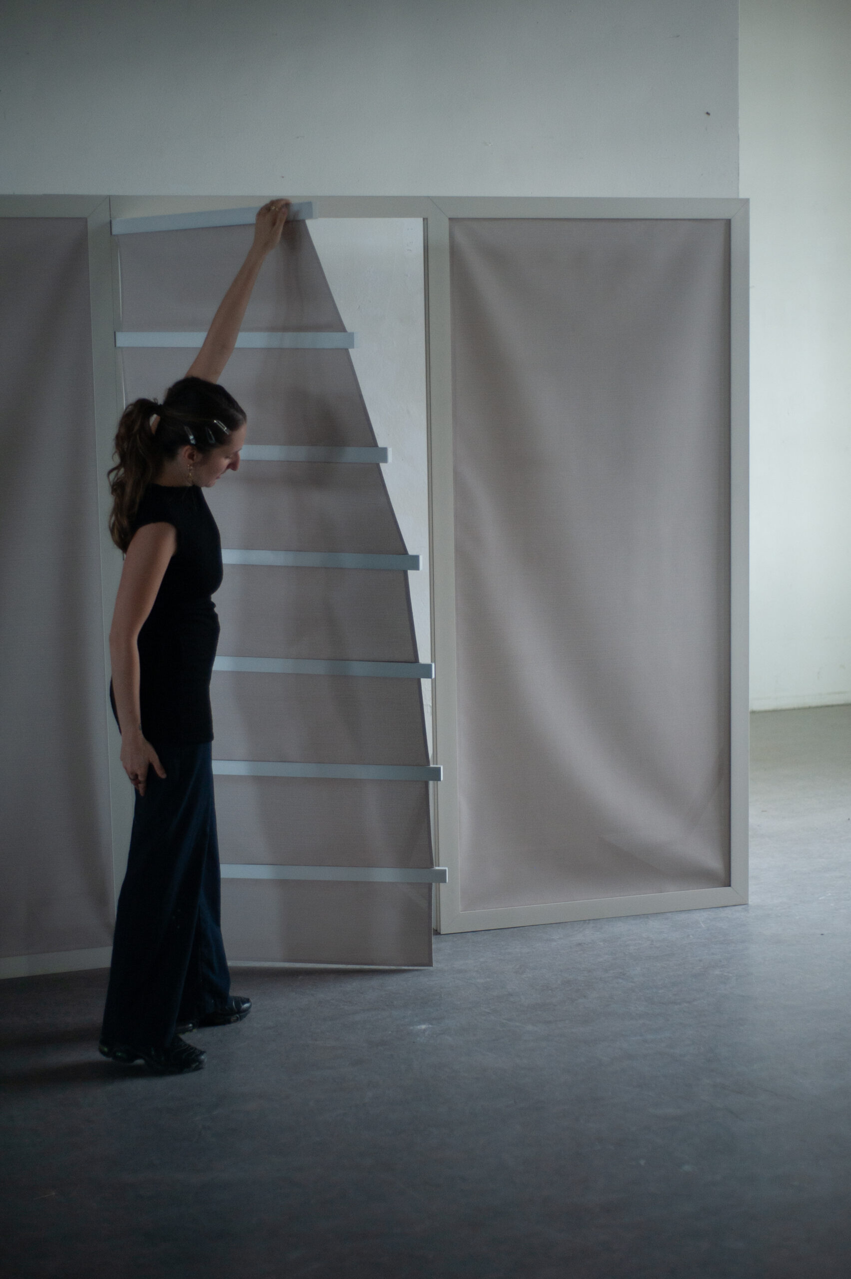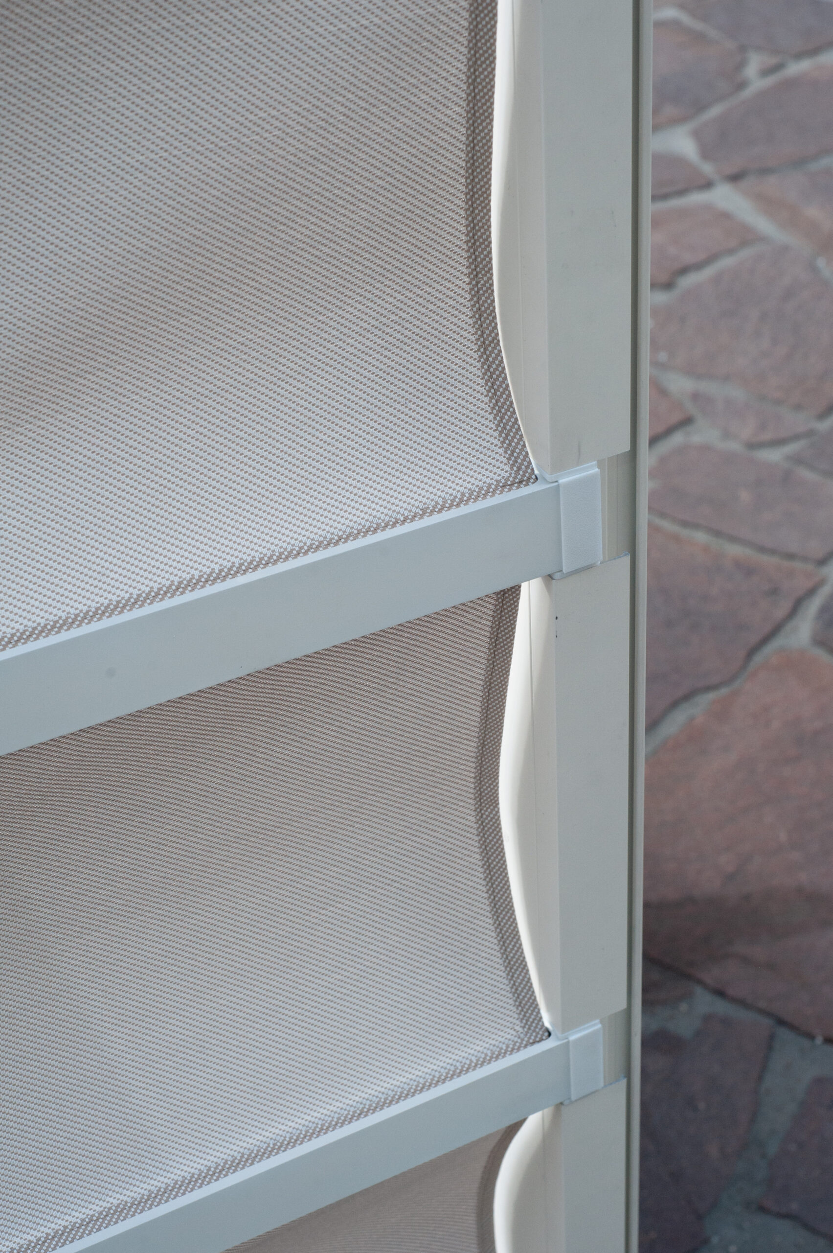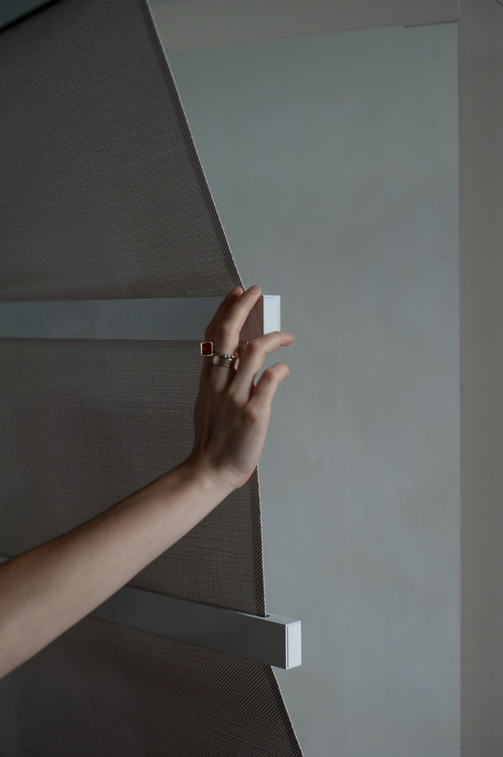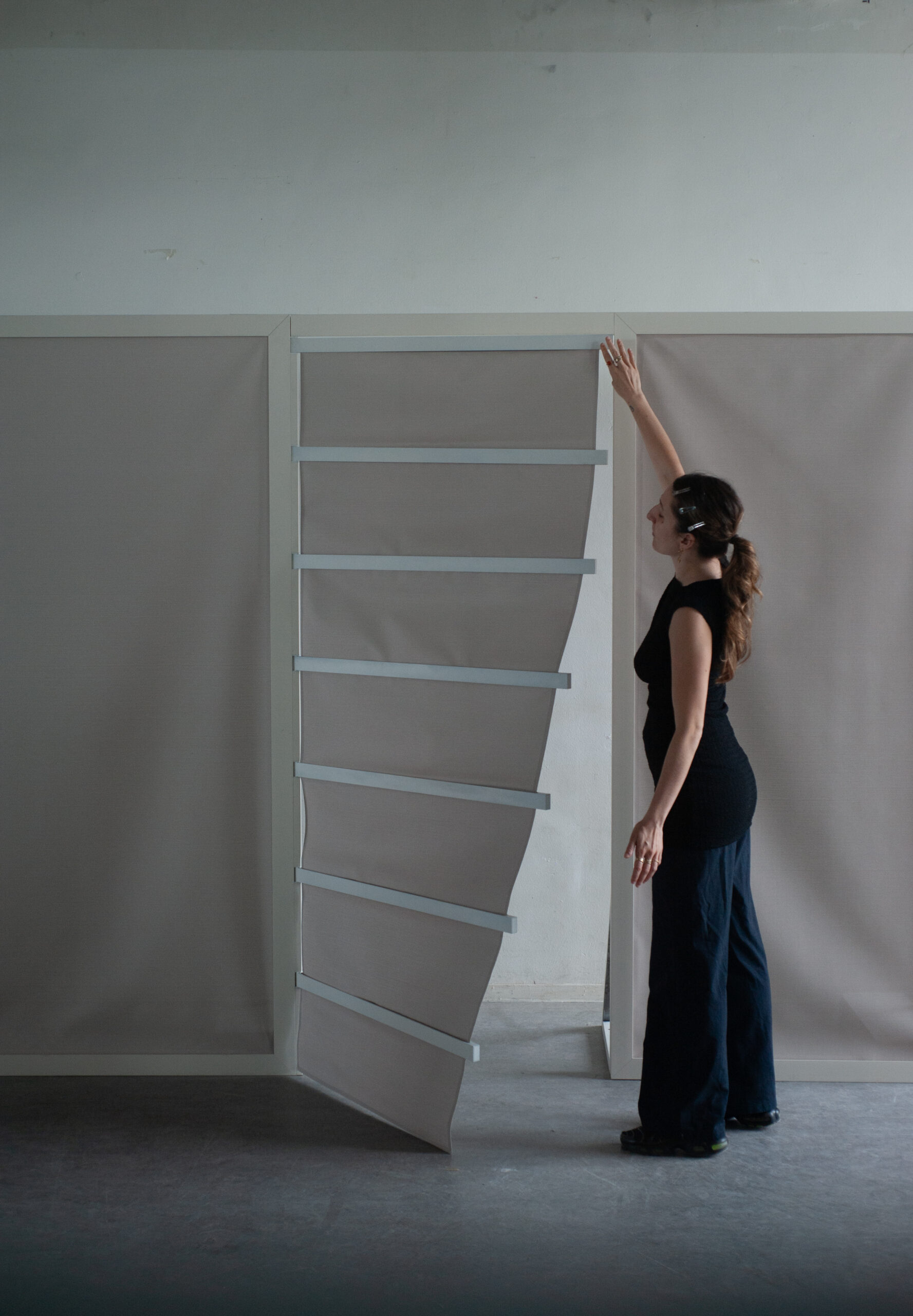 The door is made from multiple aluminum extrusions and connected by sunshade textile. This allows it to be pushed and pulled into multiple shapes, giving the door a fluid form. The aluminum extrusions provide both lightweight strength and a visual structure to match the door’s fluid form, while the sunshade textile provides a semi-transparent barrier that retains its architectural element in the space.